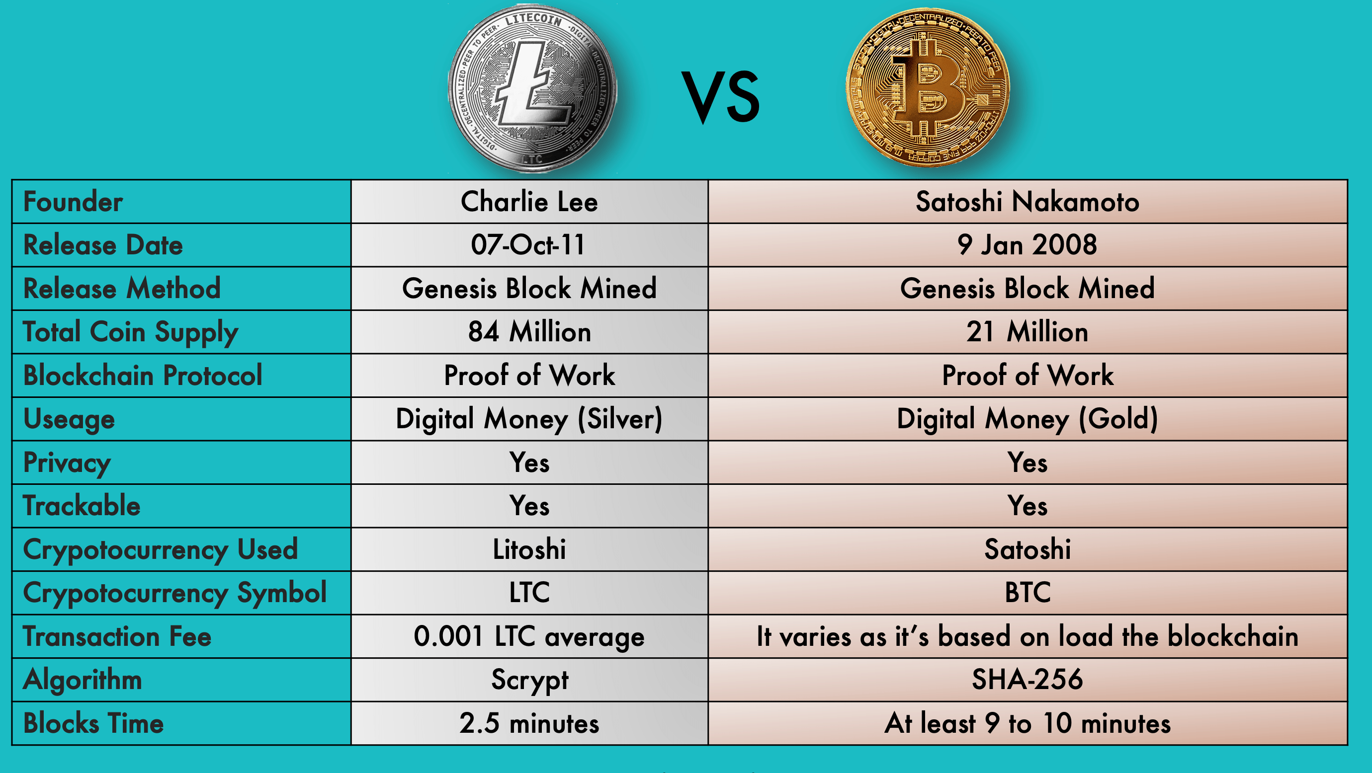 Litecoin – mặc dù tương tự như Bitcoin trong hầu hết các khía cạnh của công nghệ cốt lõi của nó, nhưng nó có thời gian tạo khối chỉ 2,5 phút. Điều này làm cho Litecoin nhanh hơn bốn lần so với Bitcoin. Litecoin sử dụng Scrypt làm thuật toán khai thác PoW, đòi hỏi ít năng lượng hơn để khai thác so với thuật toán SHA-256 của Bitcoin. Litecoin cũng sử dụng một phần mềm nút đầy đủ mã nguồn mở được gọi là Litecoin Core để xác thực các giao dịch và khối trên mạng Litecoin.